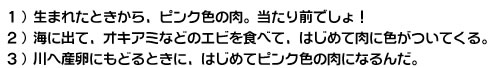 これらのカロテノイドは、オキアミや海藻を食べた小魚や貝の中に蓄積され、 それを食べた魚の中に、さらに蓄積される。さて、ここでクイズじゃ!
